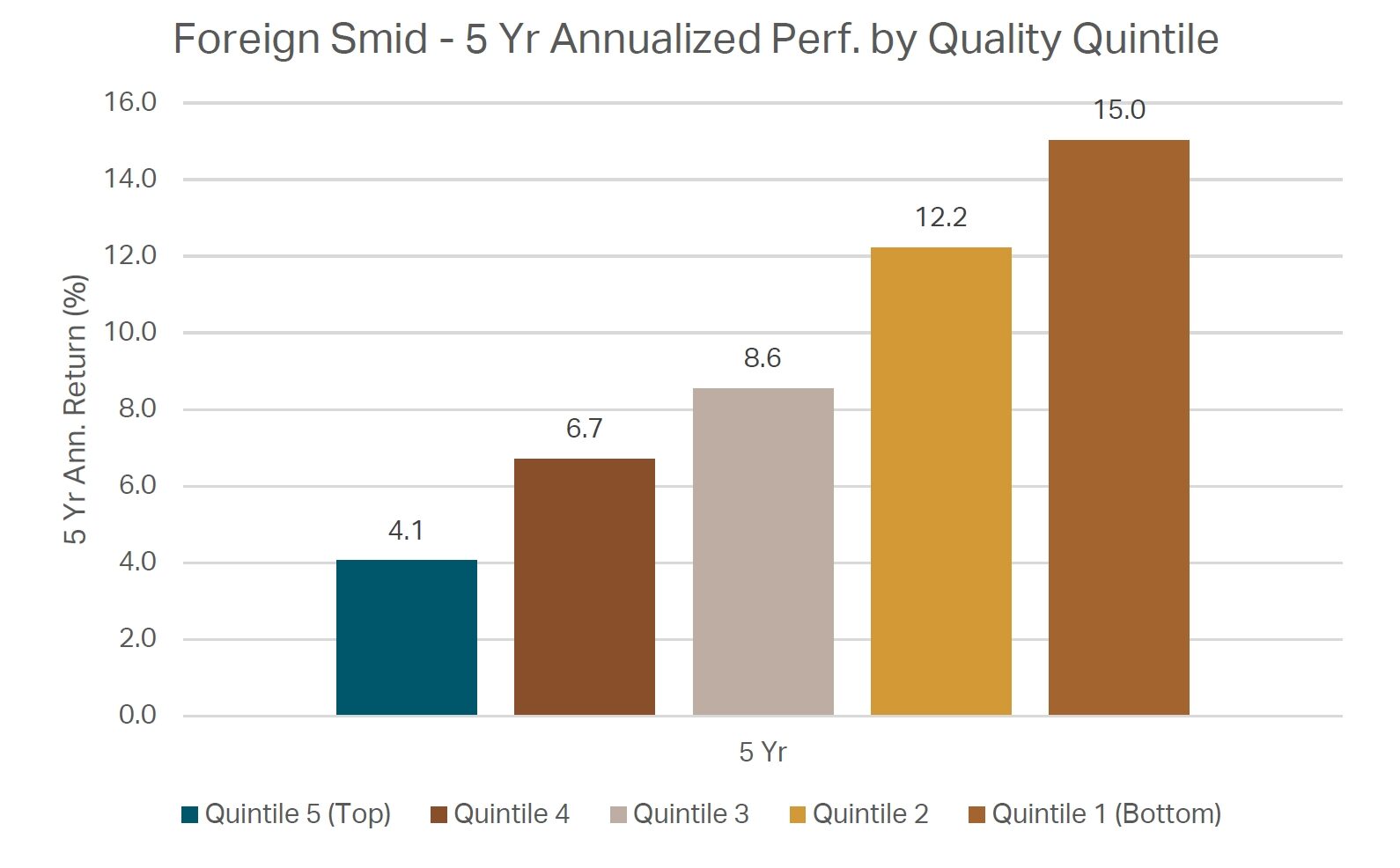 As you might expect, the low-quality, speculative “dumb money” rally continues to favor the lowest-quality funds in the Morningstar Foreign Smid Cap Category. In fact, the lower the quality, the better the return. As of quarter-end, the five-year annualized return of the lowest-quality quintile of foreign small-cap U.S.-based funds in the Morningstar category was 15.0% versus the highest quality quintile’s performance of 4.1%2. In cumulative terms, low quality has outperformed high quality by 83.1% over this period.