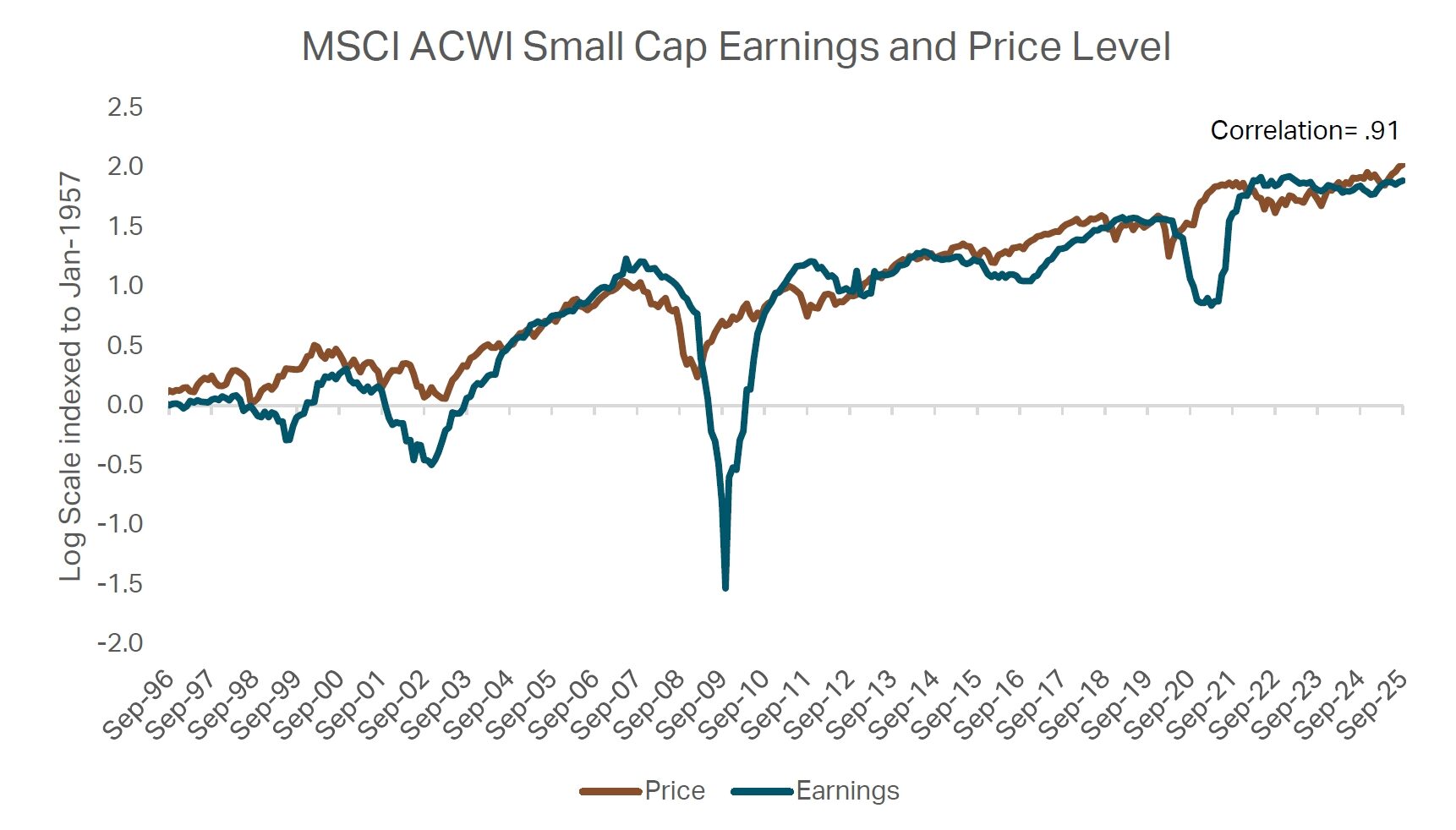 Periods like this test conviction. At Grandeur Peak, our guiding conviction—our “north star”—is that earnings growth drives long-term price performance. Over time, the correlation between price and earnings is remarkably strong (see Exhibit 4), though it does not always hold in the short term.